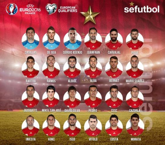 La lista la forman: Casillas, De Gea, Sergio Rico, Juanfran, Carvajal, Piqué, Bartra, Ramos, Alba, Bernat, Busquets, San José, Koke, Nolito, Cazorla, Iniesta, Cesc, Isco, Aleix Vidal, Silva, Morata, Alcácer, Vitolo y Pedro.